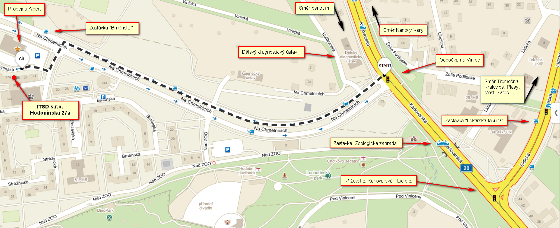 Autem: z centra pokračovat k rondelu, dále po Karlovarské třídě směrem na Karlovy Vary, od rondelu po cca 1km odbočit doleva na Vinice (ul. na Chmelnicích), na druhé křižovatce odbočit doleva a hned doprava kolem prodejny Albert, dále rovně cca 50m.